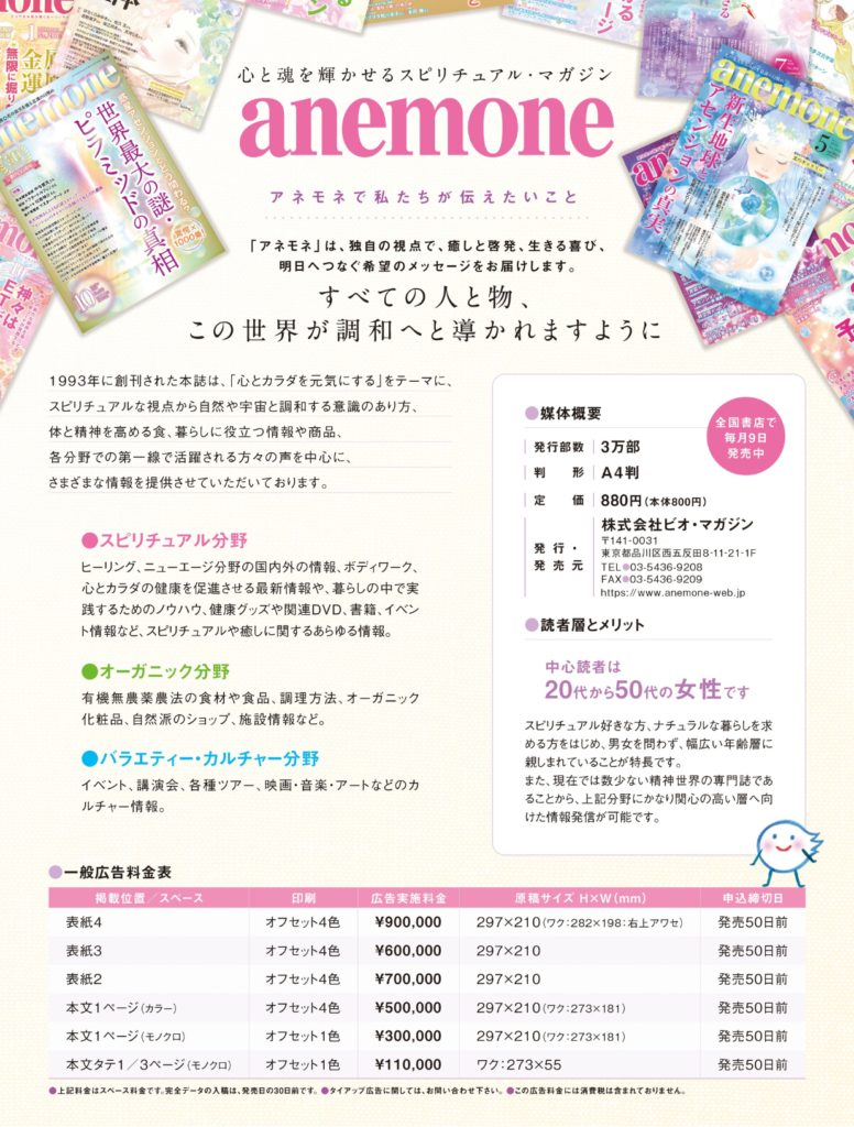 1993年に創刊された月刊誌『アネモネ』は、スピリチュアルな視点から自然や宇宙と調和する意識のあり方、体と精神を高める食や、暮らしに役立つ情報や商品、各分野での第一線で活躍される方々の声を中心に、さまざまな情報をお伝えしています。